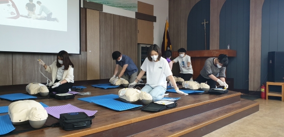 | 성의중학교(교장 장재원)에서 코로나-19 감염병으로 2년동안 유예되었던 심폐소생술 등 응급처치 교육을 7월 7일(목) 본교 시청각실에서 전교직원을 대상으로 실시하였다.
