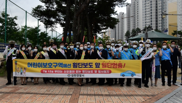 김천경찰서 교통관리계는 “12일부터 시행되는 어린이보호구역 내 신호기 없는 횡단보도 앞 일시정지 의무 등 도로교통법 개정안을 적극 홍보하여 어린이들의 안전한 등·하굣길을 만드는데 최선을 다하겠다 ‘고 밝혔다. |