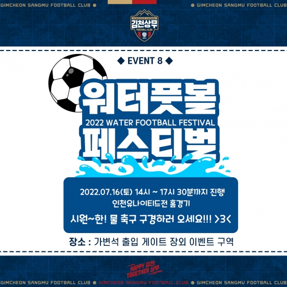 | 김천상무가 인천전 홈경기에서 7월 홈 3연전 출석체크 이벤트를 달성한 선착순 100명에게 마스코트 슈웅 쿠션을 증정한다. 경기 시작 4시간 전부터는 장외에서 ‘워터풋볼 페스티벌’도 개최한다.