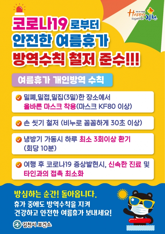 김충섭 김천시장은 “코로나19로부터 나와 내 가족의 안전을 지키기 위해서는 마스크 착용, 손 씻기 등 개인위생을 철저히 하고, 주기적인 실내 환기 등 기본적인 개인방역 수칙 준수와 함께 코로나19 예방접종, 사적모임 최소화, 직장과 다중이용시설 내 밀집도 완화 등 자발적 거리두기 실천이 가장 중요”하다며“코로나19 확산을 예방하기 위해서는 시민들의 협조가 무엇보다 필요하다”고 거듭 당부했다. |