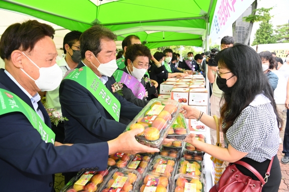 | 김천시(시장 김충섭)는 7월 21일 자매도시 군산시를 방문해 지역을 대표하는 농특산물 포도, 자두, 복숭아 홍보·판촉 행사를 열었다. 이날 행사는 김충섭 김천시장을 비롯하여 이명기 김천시의회 의장, 오세길 부의장 및 시의원, 김진욱 농협김천시지부장, 지역농협장, 농업인단체장 등이 참석했으며, 준비한 농특산물 사전주문 포함 3천 박스(포도 600, 자두 900, 복숭아 1,500)가 6천여만원의 판매고를 올렸다.