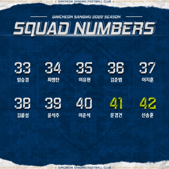 U22 5인방 중 2019 브라질 FIFA U-17 월드컵 멤버인 김륜성, 윤석주, 신송훈은 각각 38번, 39번, 42번을 선택했고 이지훈, 이준석은 각각 35번, 40번을 달았다. 김준범은 36번을, 수문장 문경건은 41번을 택했다. 한편, 국군체육부대에 합류한 신병 10인은 김천의 분위기 반전을 통한 팀 성적 향상에 힘쓸 예정이다.