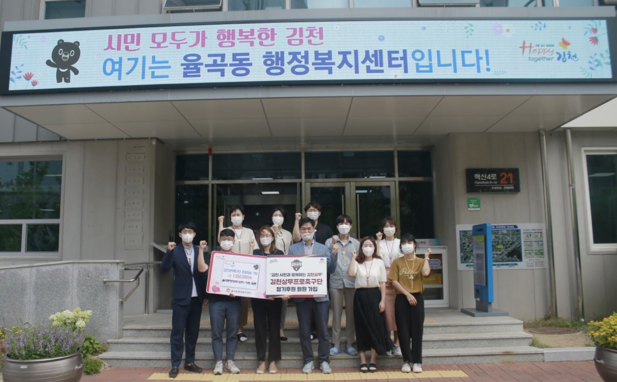 율곡동행정복지센터 전 직원은 지난 7월 22일(금) 시민의 건전한 여가선용과 스포츠도시로써의 위상을 높이고 있는 김천상무프로축구단의 발전을 위해 후원금 105만원을 전달하고, 회원 가입(골드4명, 실버11명)을 완료했다.