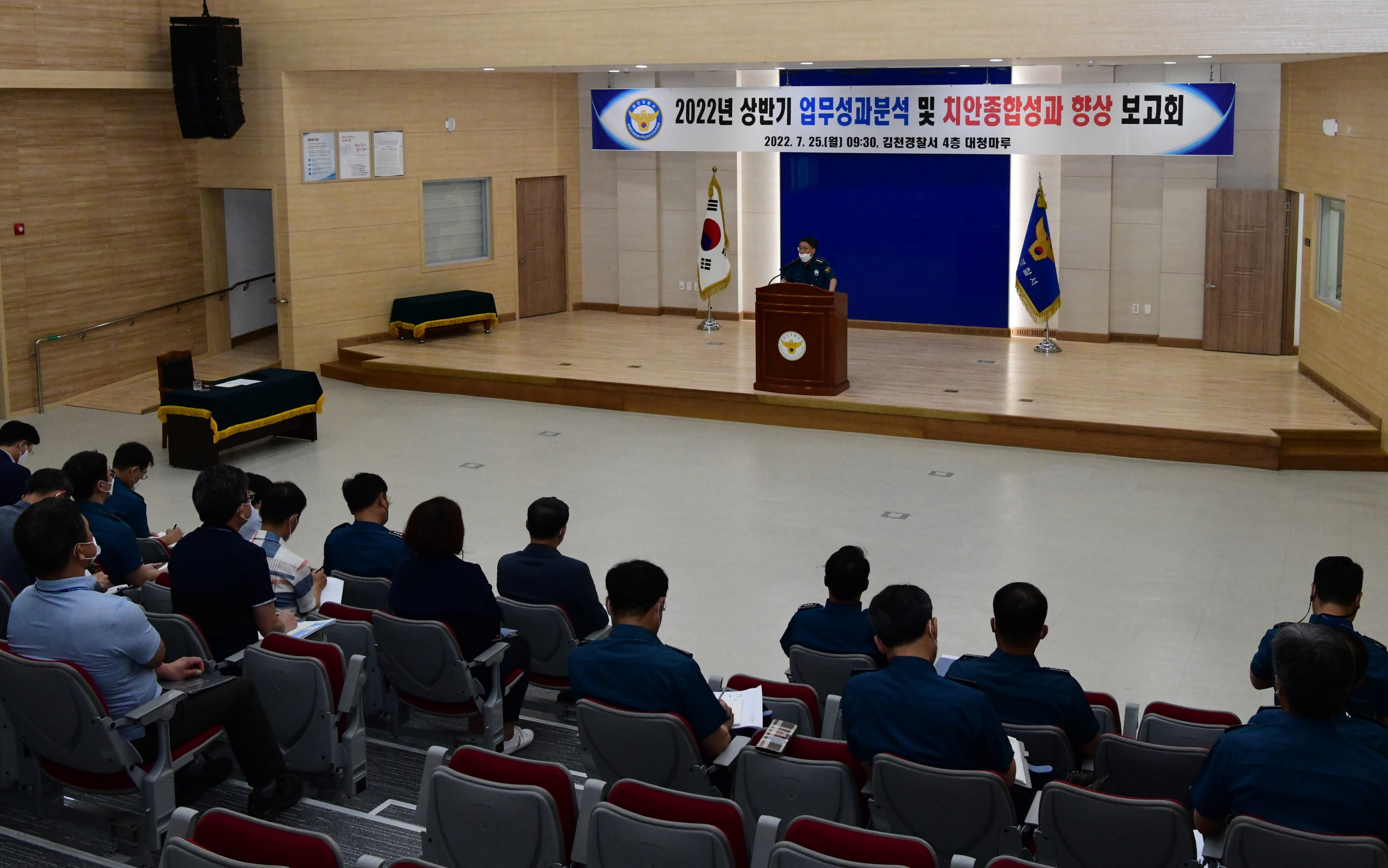 | 김천경찰서(서장 김기대)는 지난 7월 25일 김천경찰서 4층 대청마루에서 각 과·계팀장 및 지구대장이 참석한 가운데 ’2022년 상반기 업무분석 및 치안성과평가 향상 보고회’를 개최했다.