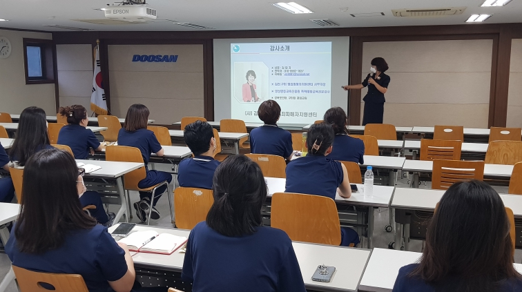 (주)두산전자사업 김천공장의 임직원을 대상으로 김태자 김천·구미 피해자지원센터 사무처장을 초빙하여 「성희롱 예방 교육」을 주제로 교육을 실시했다.