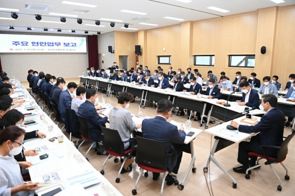 | 김천시(시장 김충섭)는 지난 7월 25일 청소년 문화의 집 3층 대강당에서 시장 주재로 「2022년도 주요 현안업무 보고회」를 가졌다.