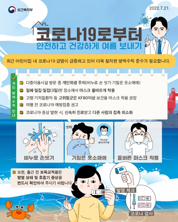 | 본격적인 휴가철을 앞두고 최근 전국적인 코로나 확산에 따라 어린이집 안에서 집단감염이 발생되지 않도록 개인방역 6대 수칙 준수와 3밀 환경(밀폐·밀접·밀집) 최소화, 자율방역 강화를 통해 방역수칙을 숙지하여 준수하여 줄 것과 종사자 간 식사, 모임, 회의 등을 할 때에도 개인방역수칙을 잘 준수하는 등 보육교직원의 감염 관리에 보다 철저를 기하여 줄 것을 요청하였다.