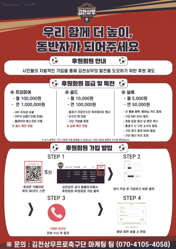 후원회원 가입은 김천상무 공식 홈페이지 내 후원회원 메뉴에서 후원회원 가입 버튼 클릭을 통해 가입할 수 있다. 관련 문의는 김천상무 사무국 마케팅 팀(070-4105-4058)으로 전화 문의할 수 있다.