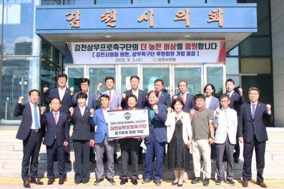 김천상무프로축구단(대표이사 배낙호)이 8월 3일 김천시의회의 ‘2022 시즌 김천상무 정기 후원회원’ 가입 행사를 진행했다. 이날 행사에는 배낙호 김천상무 대표이사, 최한동 후원회장, 이흥실 단장을 비롯해 김천시의회 18명의 시의원들이 참석했다. 이명기 김천시의장, 오세길 부의장을 포함해 18명의 시의원들과 김천시의회 사무국이 김천상무 후원회원의 일종인 골드 후원회원에 가입했다.