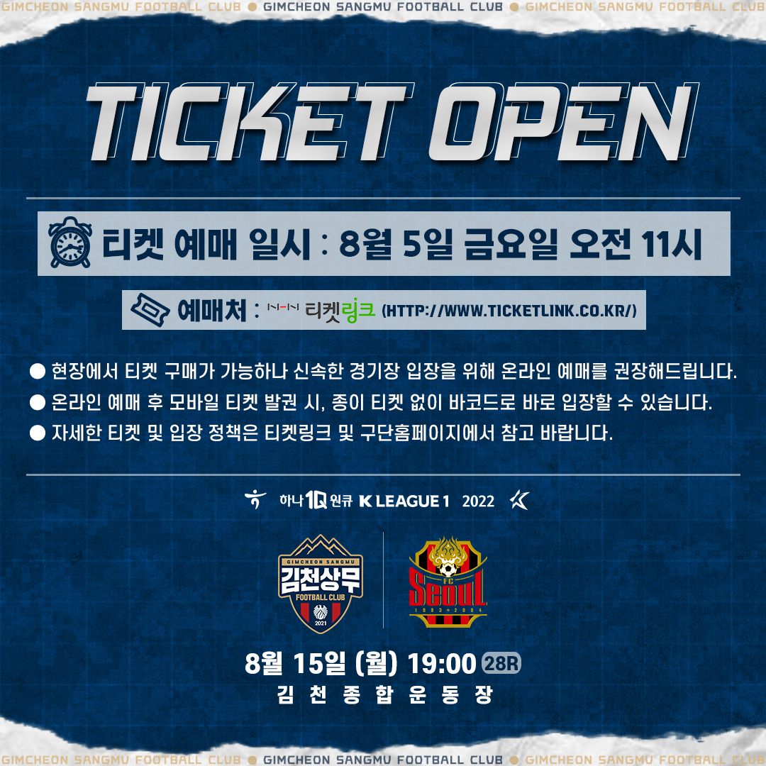 김천상무프로축구단(대표이사 배낙호)이 5일 오전 11시, 온라인 예매 사이트 티켓링크를 통해 8월 15일 오후 7시, 김천종합운동장에서 열리는 ‘하나원큐 K리그1 2022’ 28R FC서울과 홈경기 티켓 예매를 시작한다.