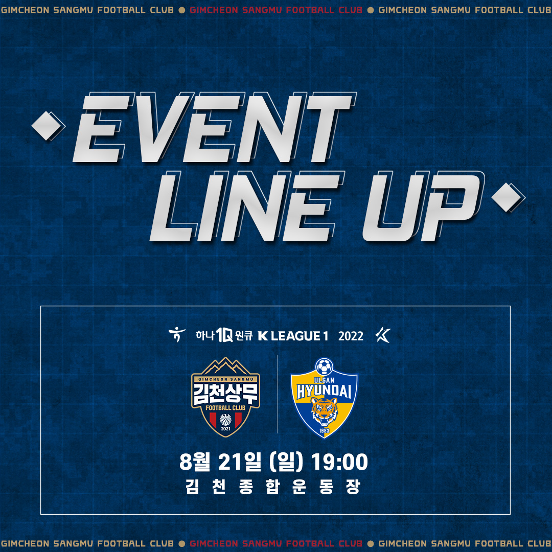 | 김천상무프로축구단(대표이사 배낙호)이 8월 21일 오후 7시 김천종합운동장에서 ‘하나원큐 K리그1 2022’ 24R 울산현대와 홈경기를 치른다. 김천상무는 울산전을 공식 서포터즈 ‘수사불패’ 데이로 꾸며 팬들을 위한 다양한 이벤트를 진행한다.