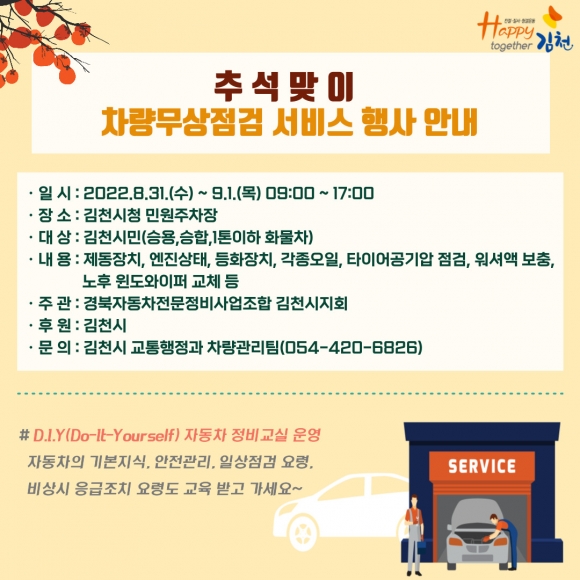 | 김천시(시장 김충섭)는 추석 명절을 맞아 오는 8월 31일 ~ 9월 1일 양일간 오전 9시부터 오후 5시까지 시청 민원주차장에서 차량무상점검 서비스 행사를 시행한다.