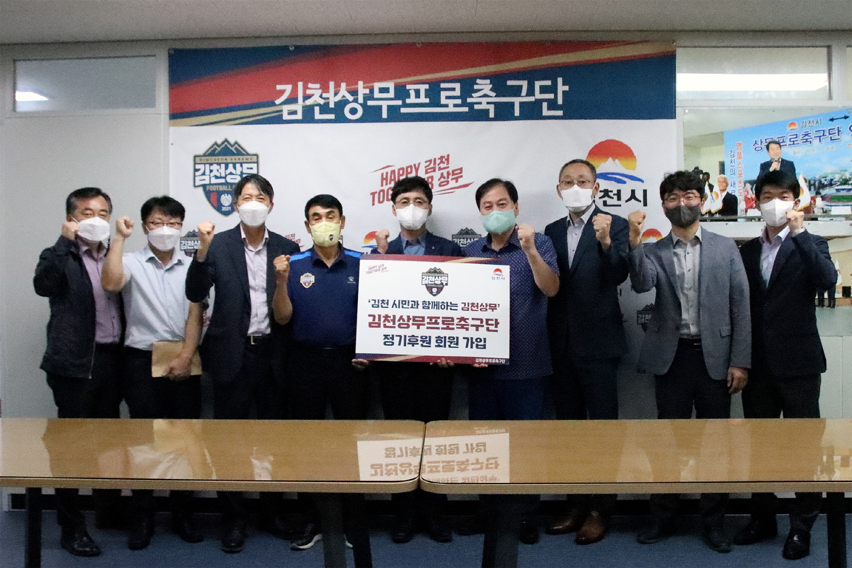| 김천상무프로축구단(대표이사 배낙호)이 8월 23일 NH농협은행 김천시지부의 ‘2022 시즌 김천상무 정기 후원회원’ 가입 행사를 진행했다. 행사에는 김진욱 NH농협은행 김천시지부장, 김준연 김천드림밸리지점장, 전상준 동김천지점장, 강동호 농정지원단장, 백창민 부지점장, 제갈영섭 총무팀장을 비롯해 배낙호 김천상무 대표이사, 최한동 후원회장이 참석했다. NH농협은행 김천시지부는 23명이 후원회원에 가입했고 9명이 골드 등급, 14명이 실버 등급으로 함께했다.