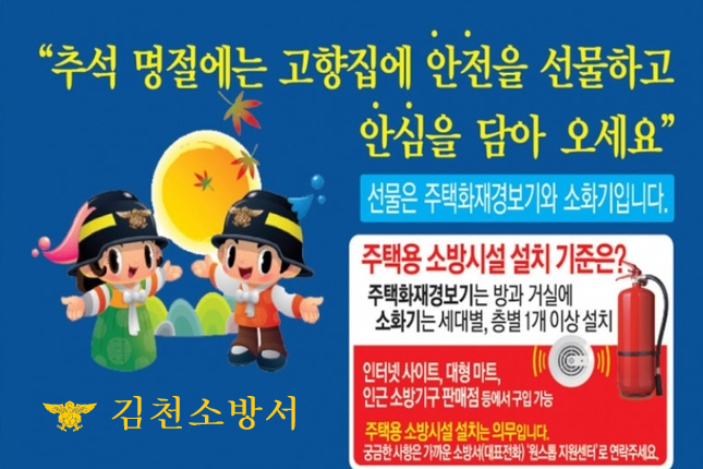 | 김천소방서(서장 전우현)는 추석 명절을 맞이하여 화재예방을 위한‘고향집 방문 전, 주택용 소방시설 온라인으로 선물하기’를 집중 홍보한다고 밝혔다.