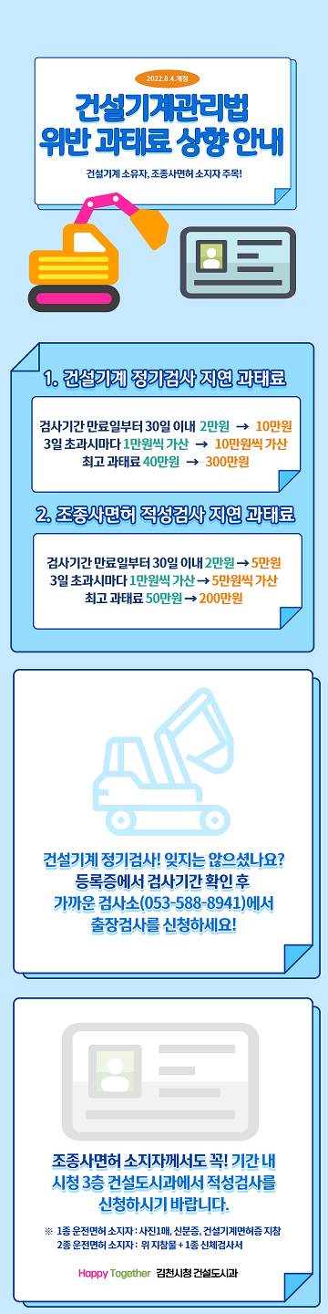 | ⓒ 김천내일신문 | 김천시(시장 김충섭)는 「건설기계관리법」 개정에 따라 건설기계 정기검사 지연과 건설기계 조종사면허 적성검사 미수검에 따른 과태료가 대폭 상향됐다고 밝혔다.