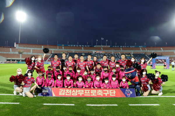 |  | | | ⓒ 김천내일신문 | | 김천상무프로축구단(대표이사 배낙호)이 지난9월3일 김천종합운동장에서 열린 ‘하나원큐 K리그1 2022’ 29R 전북현대와 홈경기에서 김준범의 득점으로 2대 2 무승부를 거뒀다.