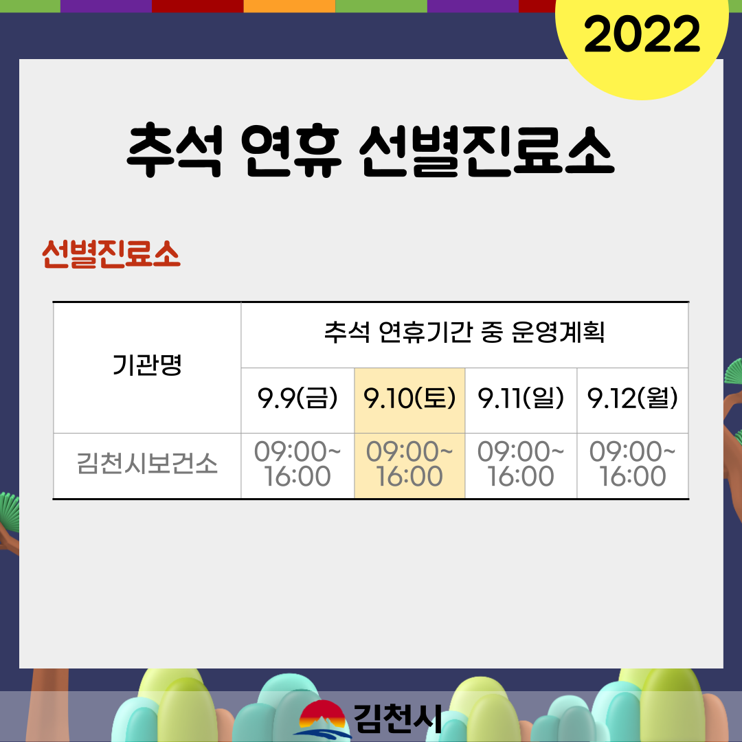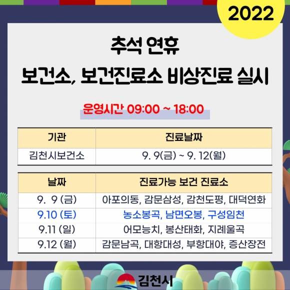 | 김천시(시장 김충섭)는 추석 명절 연휴기간인 9.9.(금)~9.12.(월)까지 응급환자 및 일반환자 진료 공백을 최소화하기 위해 김천시 의사회, 약사회 등과 협조하여 응급의료체계를 구축한다고 밝혔다.