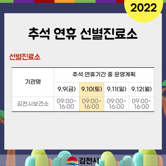 또한 코로나19 감염병 발생 상황에 신속히 대응하기 위해 연휴기간동안 김천시보건소 선별진료소도 정상 운영(09:00~16:00)한다. 추석연휴 기간 호흡기·발열증상 환자에 대한 진료(09:00~18:00)도 함께 실시한다.