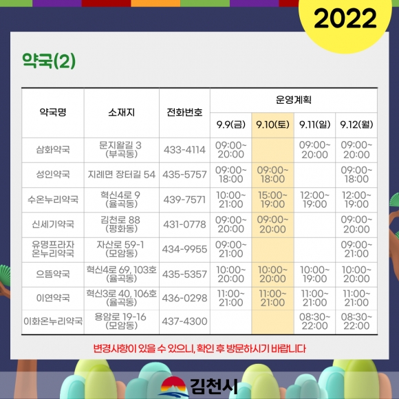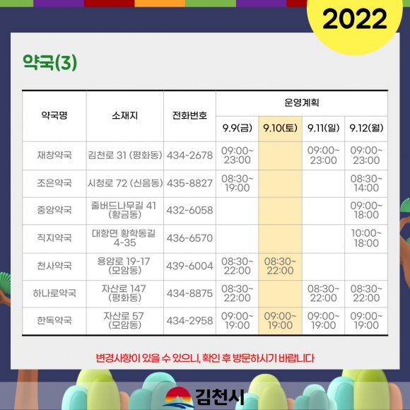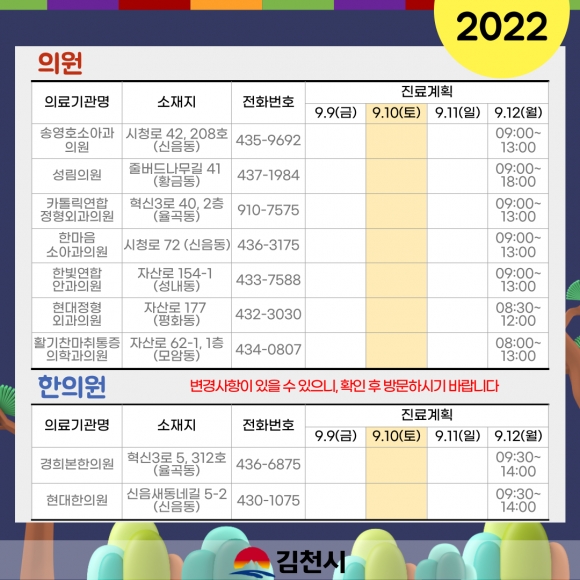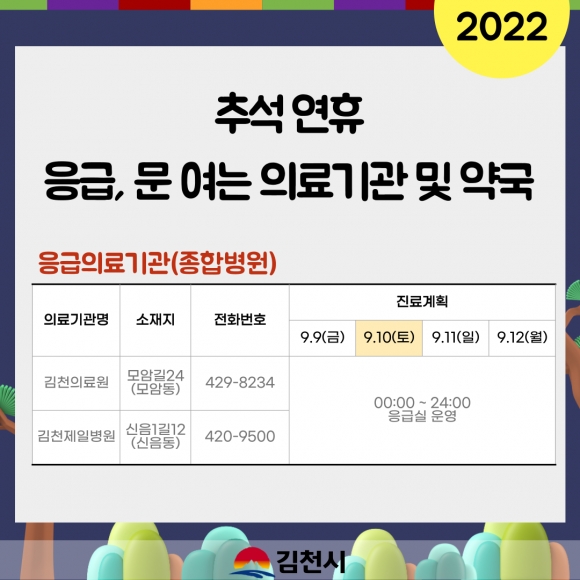 추석 연휴기간 중 문 여는 의료기관 및 약국에 대한 정보는 보건복지콜센터(129), 119구급상황관리센터(119), 경상북도 콜센터(120), 김천시보건소(433-4000)로 연락하거나 김천시청·김천시보건소 홈페이지, 응급의료포털(www.e-gen.or.kr), 스마트폰 앱(응급의료정보제공), 포털사이트에서 ‘명절 진료’로 검색하면 안내받을 수 있다.