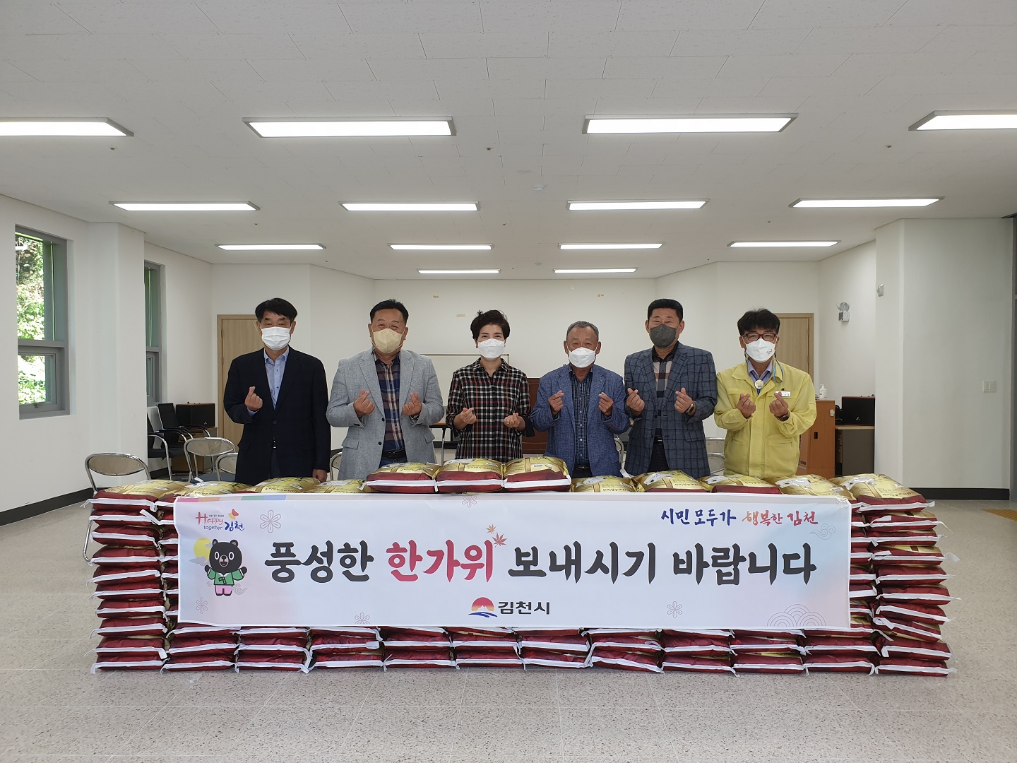 | 김천시(시장 김충섭)에서는 9월 7일 민족 대명절 추석을 앞두고 나눔의 손길이 필요한 복지소외이웃과 사회복지시설을 방문하여 위문품을 전달하며 이웃들과 사랑을 나누는 시간을 가졌다. 삼애원과 임마누엘영육아원을 포함한 사회복지시설 등 56개소에 간식과 화장지, 백미 등 시설에 필요한 물품을 전달했으며, 읍면동 취약계층 450세대에는 생필품세트와 김세트를 전달했다.