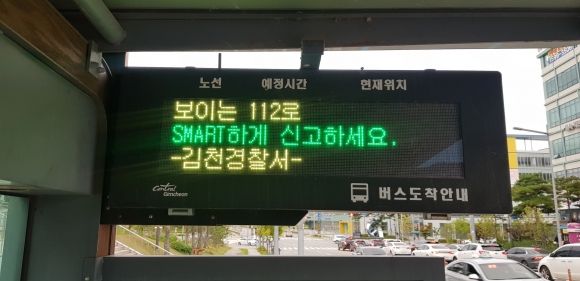| 김천경찰서(서장 김기대)는 지난 1일부터 10월말까지 2개월간 김천시와 협업하여 김천역광장, 혁신농협사거리 등 대형 전광판(8개소)과 버스승강장정보안내(BIT)등 120여 개소에서 24시간 실시간 송출 해「보이는 112」신고 홍보에 나섰다.