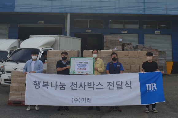 참깨, 김, 라면, 칫솔, 치약, 마스크 등 생활에 필요한 용품들로 구성되어 있는 천사박스는 관내 저소득 200가구에 전달할 예정이다. 이날 전달식에 참석한 최기태 대표는 “코로나19 재확산과 태풍 피해, 어려운 경기에 도움이 필요한 이웃들에게 힘이 되었으면 하는 마음으로 천사박스를 전달하게 됐다. 앞으로도 항상 이웃과 함께한다는 마음으로 주변 이웃에게 따뜻한 사랑을 전하겠다.”라고 말했다. 김충섭 시장은 “꾸준히 나눔을 실천해주시는 주식회사 미래의 임직원 여러분께 깊은 감사를 드린다. 경제적, 사회적으로 어려운 상황에 있는 이웃들에게 따뜻한 마음이 담긴 천사박스를 잘 전달하겠다.”라고 말했다.