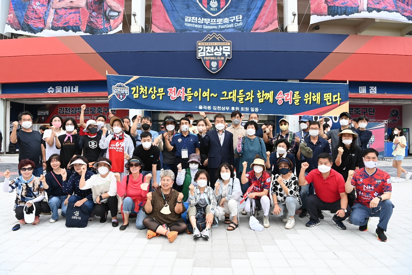 율곡동 후원 회원과 가족들은 경기 전 K1리그 11위로 하위권에 맴돌고 있는 김천상무축구단에 힘을 보태고자 자체 현수막 제작과 응원 도구를 준비하여 김천 상무 선수들의 승리를 위해 열띤 응원전을 펼쳤다. 율곡동 응원에 힘입어 김천상무는 상위스플릿이 확정된 강호 인천FC를 1대0으로 승리해 강등권 탈출을 위한 반등의 계기를 마련했다. 이날 참석한 후원 회원들은 가족들과 치킨과 간식을 먹으며, 김천상무의 승리를 만끽하는 등 즐거운 시간을 가져 많은 호응을 받았다.