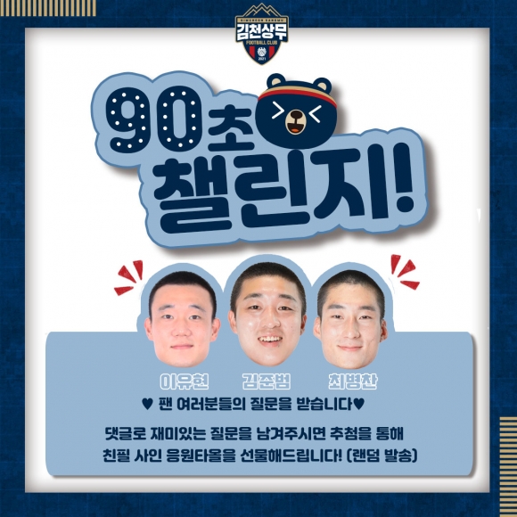 | 김천상무프로축구단이 신병 이유현, 김준범, 최병찬에게 질문하고 영상으로 답하는 ‘90초 챌린지’ 콘텐츠를 진행한다.