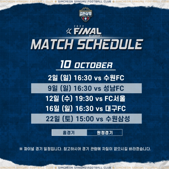 김천상무프로축구단(대표이사 배낙호)이 9월 21일 오후 2시부터 28일 오후 2시까지, 구단 온라인 샵(https://gimcheonfcshop.com/)을 통해 새로운 MD(Merchandise)를 판매한다. 출시 품목은 선수 응원 타올, 유니폼 그립톡, 무릎담요, 팀 머그, 마우스&키보드 장패드, 폰 스트랩이다. 프리오더 기간 동안은 출시 제품을 10% 할인가로 구매할 수 있으며 프리오더 종료 후에는 정상가로 판매한다. 수령까지는 프리오더 종료일로부터 약 10일(영업일 기준) 가량 소요된다.
