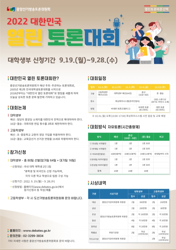 | 중앙선거방송토론위원회는 청소년들의 정치적 관심 제고와 올바르고 성숙한 토론문화 활성화를 위해 「2022 대한민국 열린 토론대회」를 개최한다고 밝혔다.