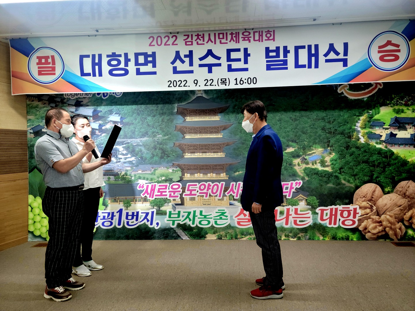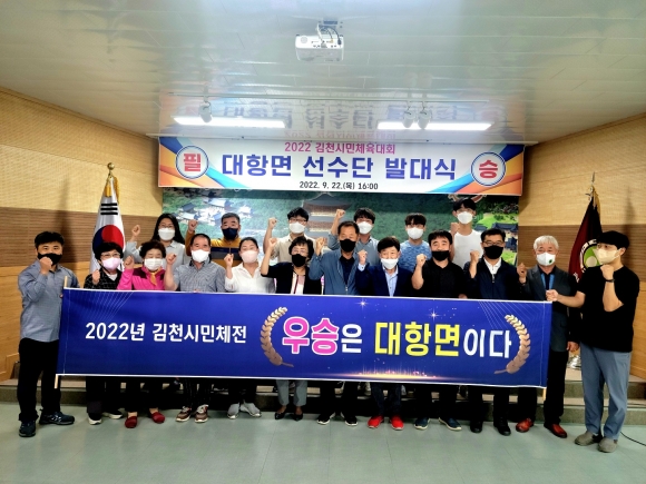 | 대항면 체육회(회장 김성용)는 9월 22일(목) 16시 면 2층 회의실에서 체육회원 30여명과 2022년 김천시민체육대회에 선수단 25명이 모인 가운데 대항면 선수단 발대식을 개최하고 필승을 다짐했다.