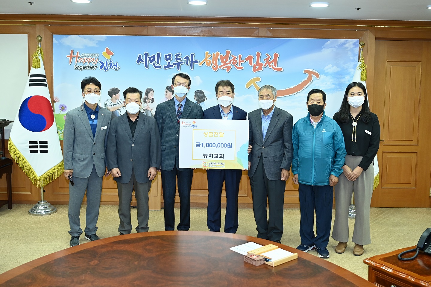 | 어모면 능치교회(목사 박배형)에서 지난 9월 22일 김천시청을 방문해 어려운 이웃에게 전달해 달라며 김천시 복지재단에 성금 100만원을 전달했다.