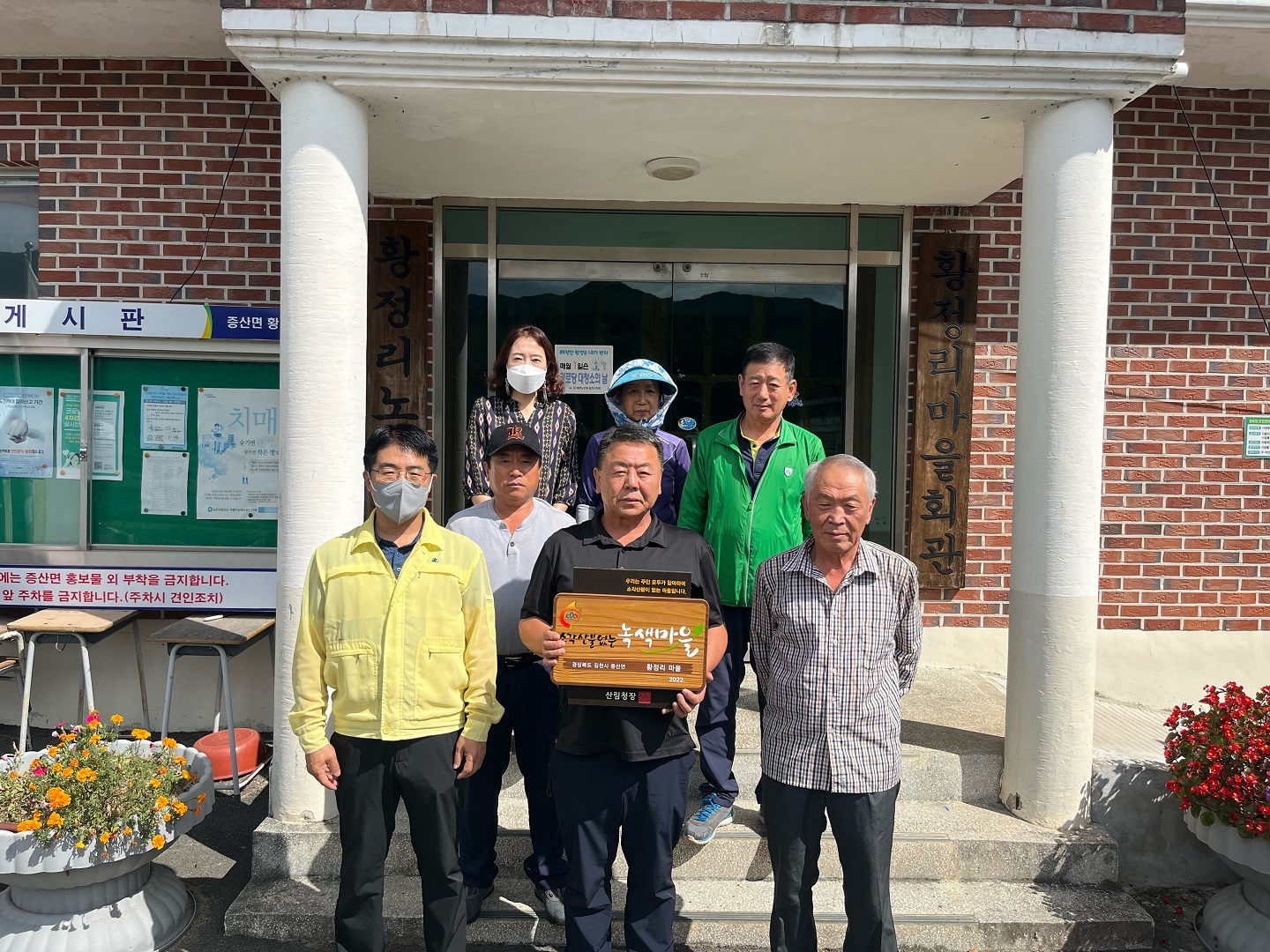 | 김천시 증산면 황정리(이장 강구진)가 산림청이 주관하는 ‘2022년 소각산불 없는 녹색마을’로 선정되어 9월 22일(목)에 황정리 마을회관에서 현판수여식을 가졌다.