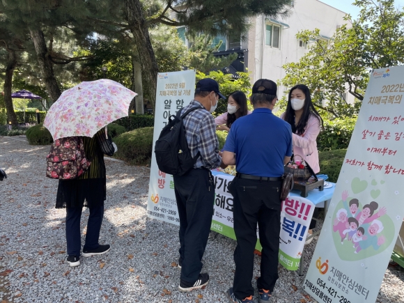| 김천시는 지난 9월 23일 제15회 치매극복의 날(9월 21일)을 기념해 치매관리의 중요성을 알리고 치매환자‧가족 및 지역사회와의 치매극복을 위한 공감대 형성을 위해 캠페인을 펼쳤다.