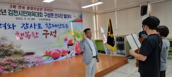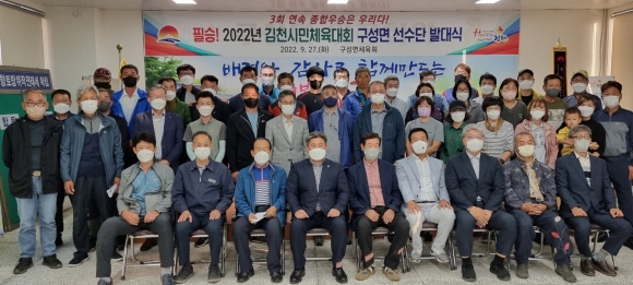 | 구성면 체육회(회장 오세진)는 9월 27일 구성면행정복지센터 2층 회의실에서 필승을 다짐하는 2022년 김천시민체육대회 구성면 선수단 발대식을 개최했다.
