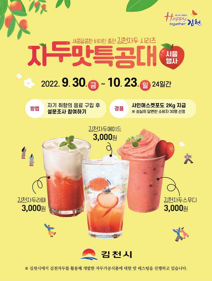 | 김천시는 9월 30일 ~ 10월 23일까지 김천자두로 만든 가공제품을 활용한 시음행사인 「자두맛 특공대」를 추진한다.