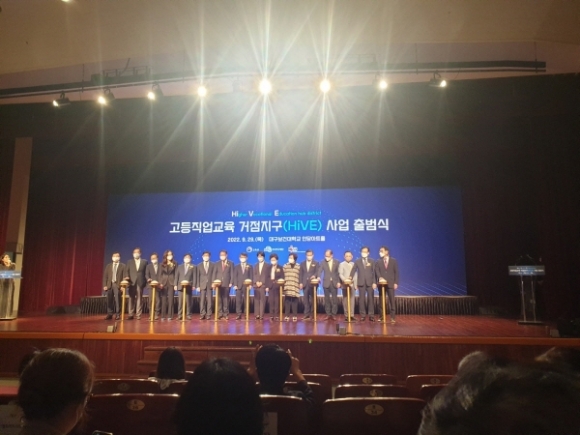 |  | | | ⓒ 김천내일신문 | | 교육부는 지난9월29일 대구보건대에서 '고등직업교육거점지구(HiVE) 사업 출범식'을 열었다. 고등직업교육거점지구(HiVE)는 전문대학이 시군구 등 기초자치단체와 협력해 지역 내 특화 분야를 선정하고, 관련 지역인재를 육성하는 거점 역할을 할 수 있도록 교육부가 지원하는 사업이다. 2022년부터 2024년까지 3년간 연 15억 원(국비 13억 5천만 원, 시비 1억5천만 원), 총 45억 원을 지원한다.