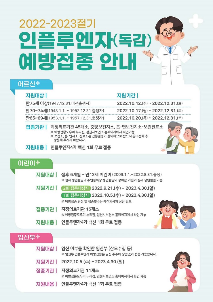 관내 위탁의료기관은 예방접종도우미 누리집 사이트 및 김천시보건소 홈페이지에서 확인할 수 있다. 그 외 보건소 및 보건지소·보건진료소는 접종 일정이 기관별로 상이하므로 반드시 사전에 전화문의(433-4000, 421-2869) 후 방문해야 하고 중앙보건지소는 10월 17일(월)부터 어르신 인플루엔자 예방접종을 시행한다. 10월 11일부터 시행되는 동절기 코로나19 추가접종과 동시 접종도 가능하다.