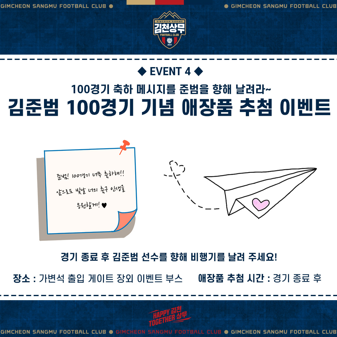 경기 전에는 개인 프로통산 100경기를 달성한 김준범의 시상식을 진행한다. 사연 접수를 통해 사전에 선정된 팬들이 김준범에게 트로피 등을 전달할 예정이다. 경기 종료 후에는 ‘준범을 향해 날려라’ 이벤트를 통해 김준범 친필사인 유니폼(상하의)을 증정한다. 이벤트 부스에서 종이에 축하 메시지 작성 후 경기 종료 후 김준범에게 종이 비행기를 날리면 선수가 직접 선정해 유니폼을 전달할 예정이다.