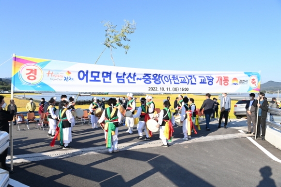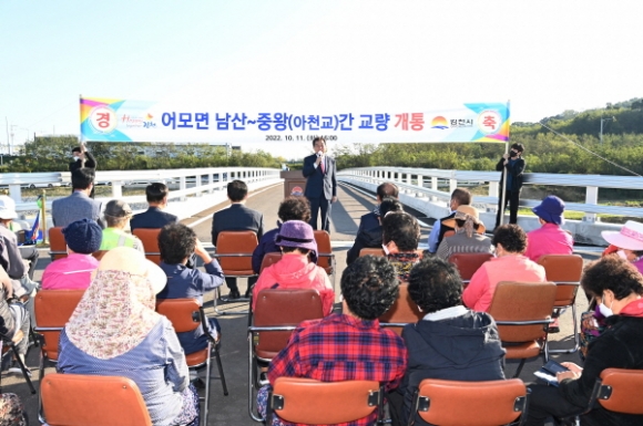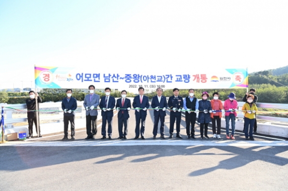 |  | | | ⓒ 김천내일신문 | | 김천시(시장 김충섭)는 10월 11일 어모면 남산리, 중왕리 주민들의 오랜 숙원사업인 남산~중왕 간 연결도로(아천교)를 완공하여, 지역주민들이 참석한 가운데 준공식을 개최했다.