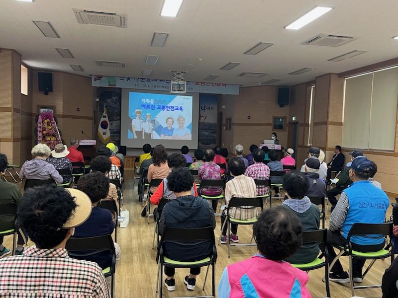 이번 교육은 TS한국교통안전공단과 김천경찰서와 협업하여 추진하는 교육으로 김천경찰서 교통관리계에서 교통안전의식이 부족한 어르신 등 교통약자를 대상으로 교통안전 교육을 실시하고, 교육 후에는 어르신들이 타고 온 전동차(실버카)에 반사판을 부착하고 안전물품(형광조끼, 야광지팡이, 전동차 형광덮개 등)을 지급하여 교통사고 및 안전사고를 예방함이 목적이다.