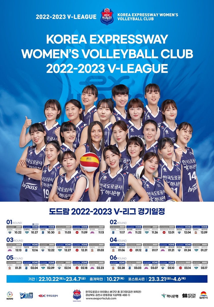 | 대한민국 스포츠 중심도시 김천시에 연고를 둔 한국도로공사 하이패스 배구단의 2022~2023 V리그 홈 개막전이 오는 10월 27일(목) 19시에 김천 실내 체육관에서 열린다. 하이패스 배구단은 GS칼텍스와의 홈 개막전을 시작으로 김천시민의 열성적인 응원과 함께 이번 시즌 총 18회의 홈경기를 치르며 두 번째 우승에 다시 도전한다.