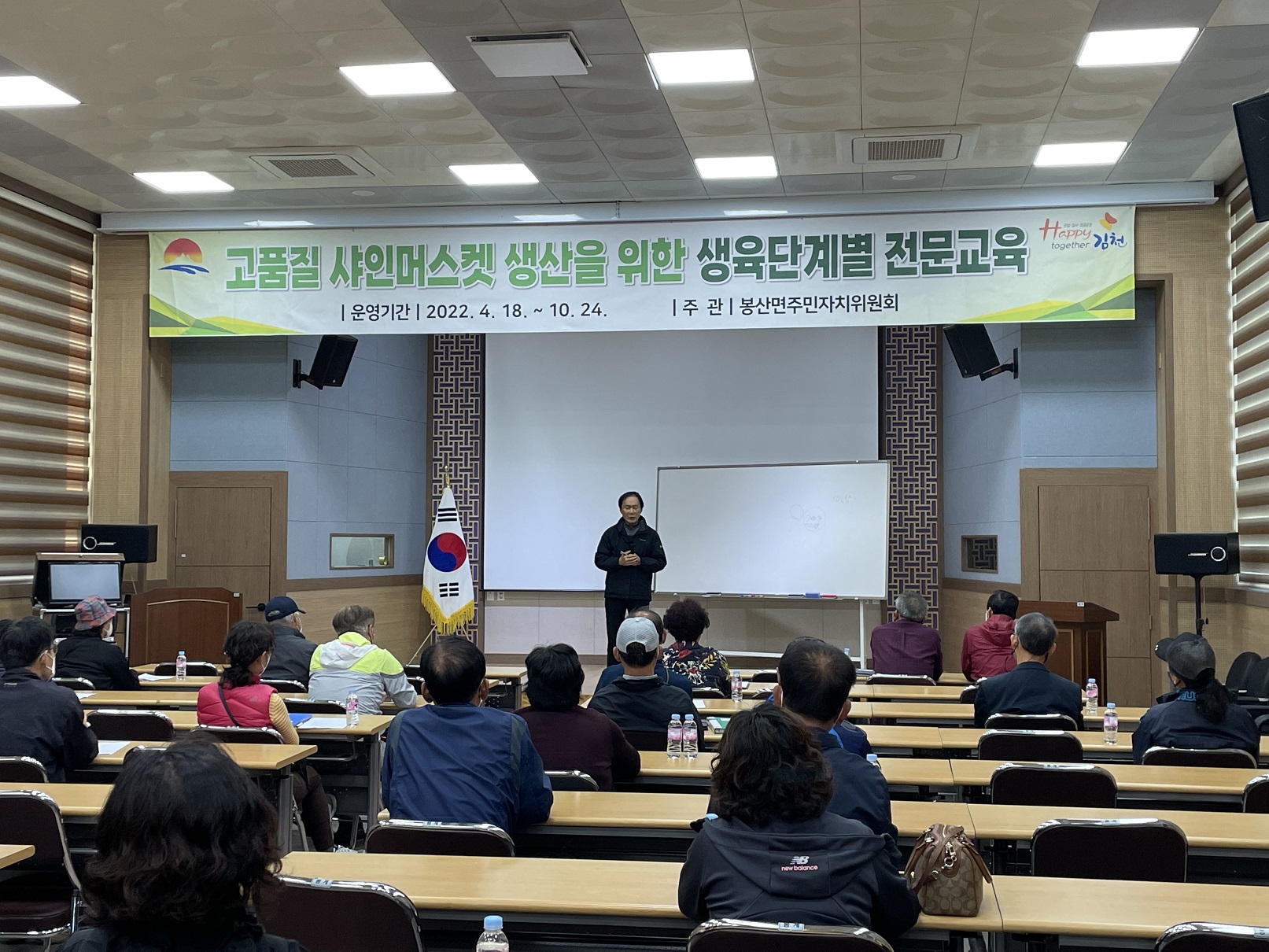 2022년 주민자치센터 활성화 사업으로 진행된 「고품질 샤인머스켓 생산을 위한 생육단계별 전문교육」은 지난 4월 18일에 개강했으며, 6개월 동안 총 9회, 이론 및 현장교육으로 실시되어 매 교육마다 교육생들의 뜨거운 관심과 참여로 「Happy Together 김천운동」실천과 봉산면 포도 농가 발전에 기여했다.