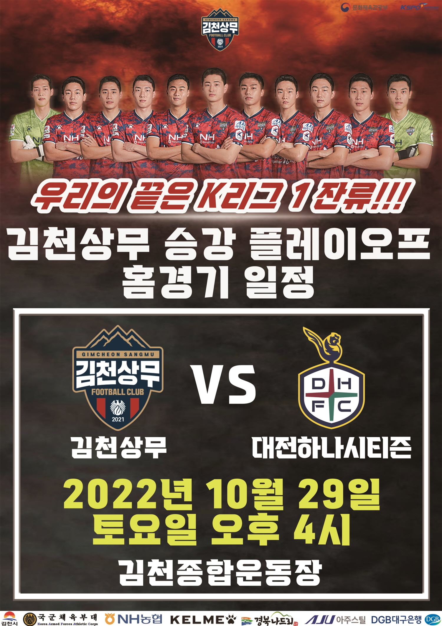 김천상무프로축구단(대표이사 배낙호)이 10월 29일 오후 4시 김천종합운동장에서 ‘하나원큐 K리그 승강PO 2022’ 대전하나시티즌과 홈경기를 치른다. 26일 대전하나시티즌과 1차전 원정경기서 한 골 차이로 패한 김천은 잔류를 위한 마지막 기회인 홈경기에서 반드시 승리한다는 다짐이다.