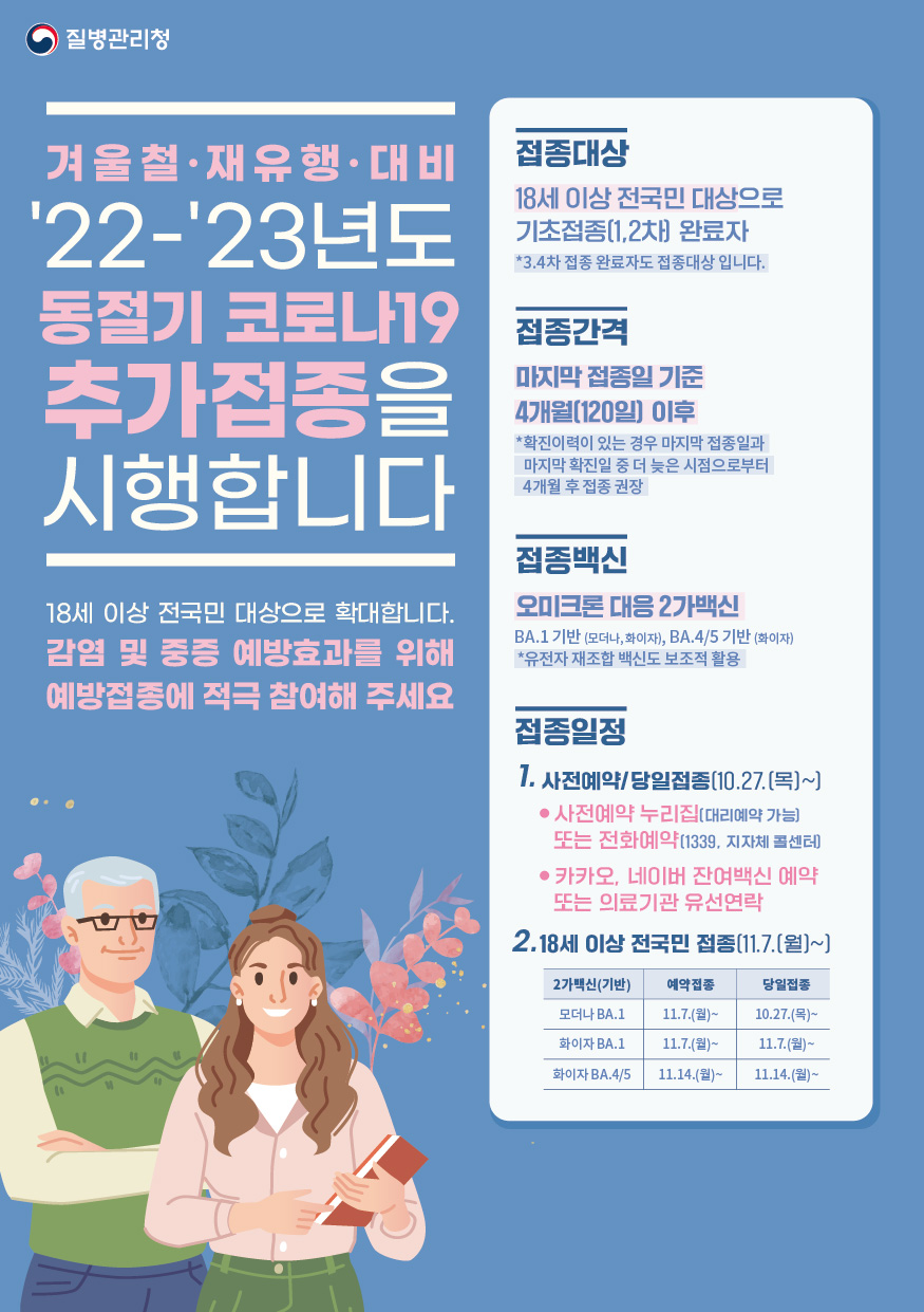 김충섭 시장은 “오미크론의 하위 변이들이 동시다발적으로 발생하고 있는 상황에서 겨울철 코로나19 재유행에 대비하기 위해 동절기 추가접종이 중요하다”며 “동절기 코로나19 추가접종에 적극 동참하시길 부탁드린다”고 말했다.김천시(시장 김충섭)는 10월 27일부터 18세 이상 모든 성인으로 전면 확대하여 동절기 코로나19 개량백신 사전예약을 시행한다. 개량백신은 3종으로 현재 접종 중인 모더나BA.1뿐만 아니라 화이자BA.1, 화이자BA.4/5가 추가된다.