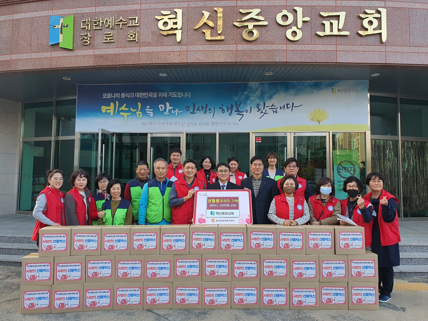 | 혁신중앙교회(목사 이충현)는 지난 10월 28일 쌀, 고추장, 김, 물티슈 등 각종 식재료와 생필품을 담은 사랑의 선물박스 40개(200만원 상당)을 율곡동 행정복지센터에 기탁했다.