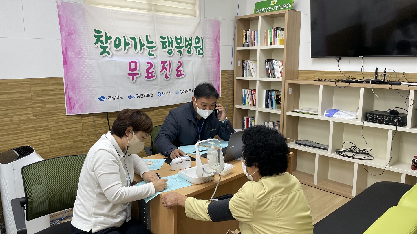 ‘찾아가는 행복병원’은 김천의료원에서 운영하는 의료복지사업으로 의료 취약계층을 대상으로 무료검진을 실시하는 사업이다. 이날 김천의료원은 의료장비를 구비한 이동차량을 이용하여 감문면 관내 의료취약계층 30여명을 대상으로 진료를 실시했다.
