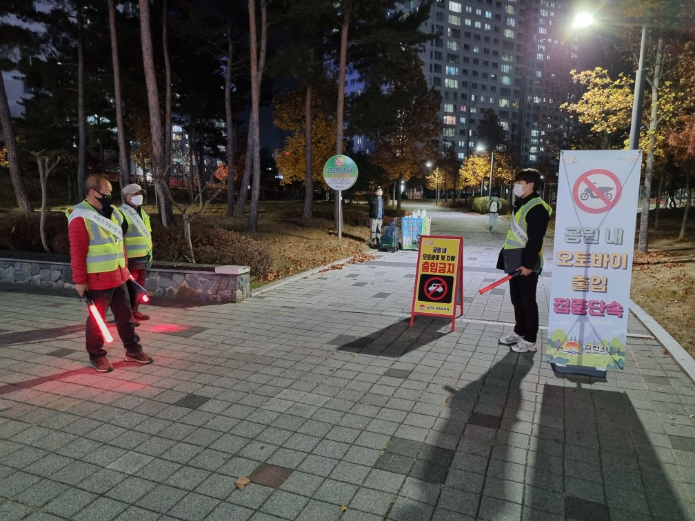 | 김천시는 공원 내 안전한 보행환경을 제공하기 위한 일환으로 2022년 11월 3일 오후 6시 30분부터 8시까지 혁신공원 내 오토바이(이륜차) 통행 근절을 위해 오토바이(이륜차) 통행이 많은 구간에서 율곡동주민센터와 합동으로 불시 계도활동을 실시했다.