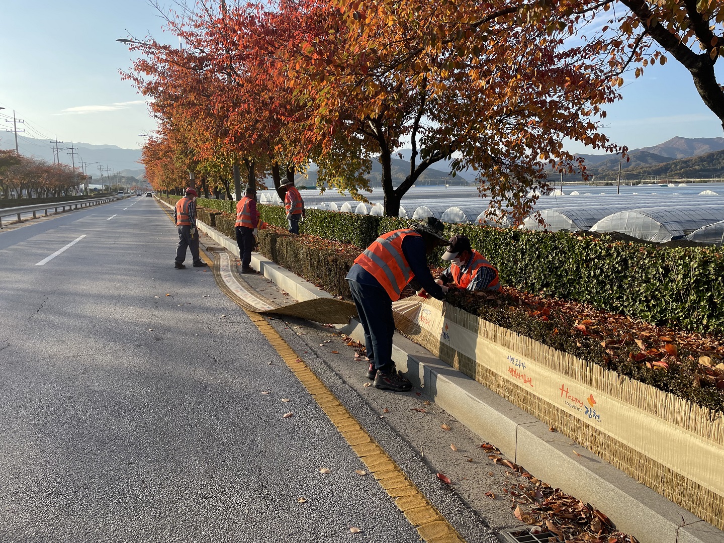 | 김천시는 겨울철 추위와 제설작업에 따른 염화칼슘으로부터 수목 보호를 위해 영남대로, 양천통로, 선산통로 등 7개 노선(약 14km)의 턱화단(회양목) 가로수 및 조경지에 월동거적 설치작업을 실시했다.