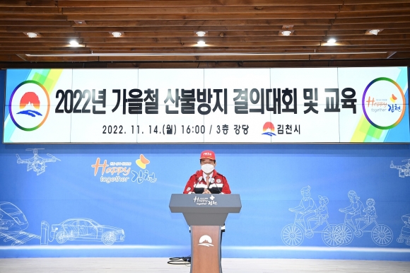| 김천시는 11월 14일 산불감시원, 산불전문예방진화대, 공무원 등 240여명이 참석한 가운데 산불방지 활동에 총력을 다 할 것을 다짐하는 ‘2022년 가을철 산불방지 결의대회 및 교육’을 김천시청 대강당에서 개최하고 본격적인 산불방지 비상체제로 돌입했다.